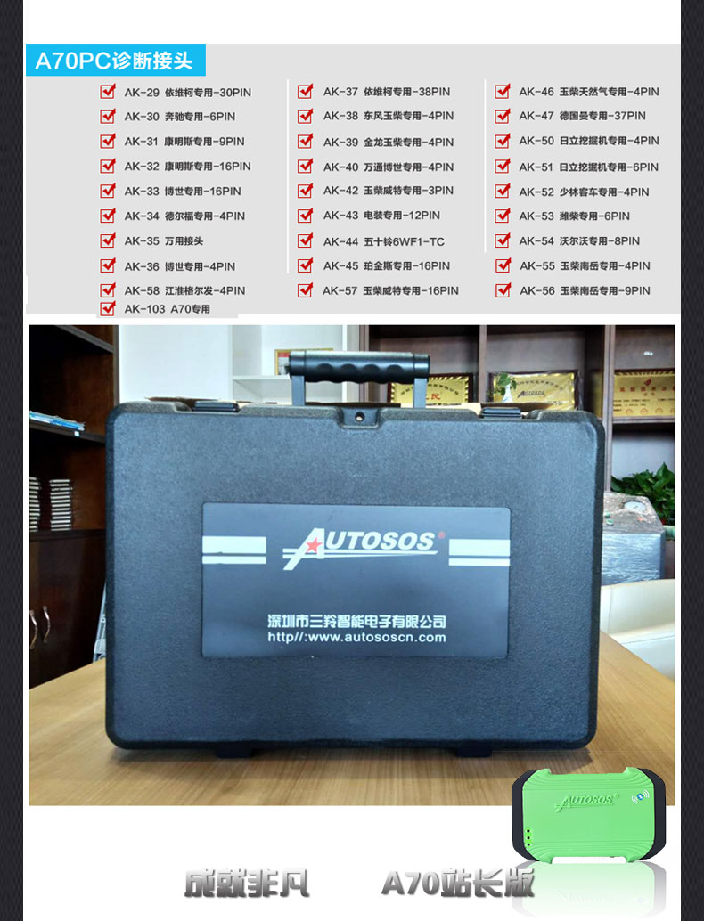 柴油測(cè)神A70站長(zhǎng)版解碼器是深圳三羚公司根據(jù)市場(chǎng)需求為社會(huì)維修廠提供的一款基于技術(shù)服務(wù)支持的綜合性汽車電腦診斷儀,也是一款綜合性工程機(jī)械診斷儀,支持手機(jī)版診斷儀,擁有國(guó)六DPF高溫再生和SCR后處理試驗(yàn)臺(tái)功能,旨在解決商用車后市場(chǎng)技術(shù)需要提升的維修廠,深圳三羚公司汽車電腦診斷儀十五年堅(jiān)持自主研發(fā),先后榮獲慧聰網(wǎng)商用車十佳售后服務(wù)企業(yè),內(nèi)燃機(jī)行業(yè)協(xié)會(huì)授予的商用車售后服務(wù)貢獻(xiàn)獎(jiǎng),從第一臺(tái)手持式A30C柴油車解碼器到測(cè)神30PC柴油車解碼器再到測(cè)神A60PC柴油車解碼器,到測(cè)神A70PC站長(zhǎng)版柴油解碼器,一直以檢測(cè)精準(zhǔn),測(cè)試全面,技術(shù)精湛,服務(wù)至上的經(jīng)營(yíng)理念深受廣大維修人員推崇,迄今為止有三千多家柴油測(cè)神A70站長(zhǎng)版解碼器用戶加盟三羚服務(wù)站,成為當(dāng)?shù)貐^(qū)域汽修龍頭中堅(jiān)力量,因其過硬的技術(shù)讓主機(jī)廠家主動(dòng)為其設(shè)立服務(wù)站,為國(guó)家汽車后市場(chǎng)努力奉獻(xiàn)。